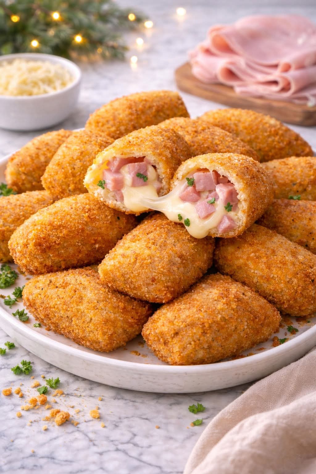3 – Deixe esfriar um pouco, modele os bolinhos recheando com presunto e queijo.